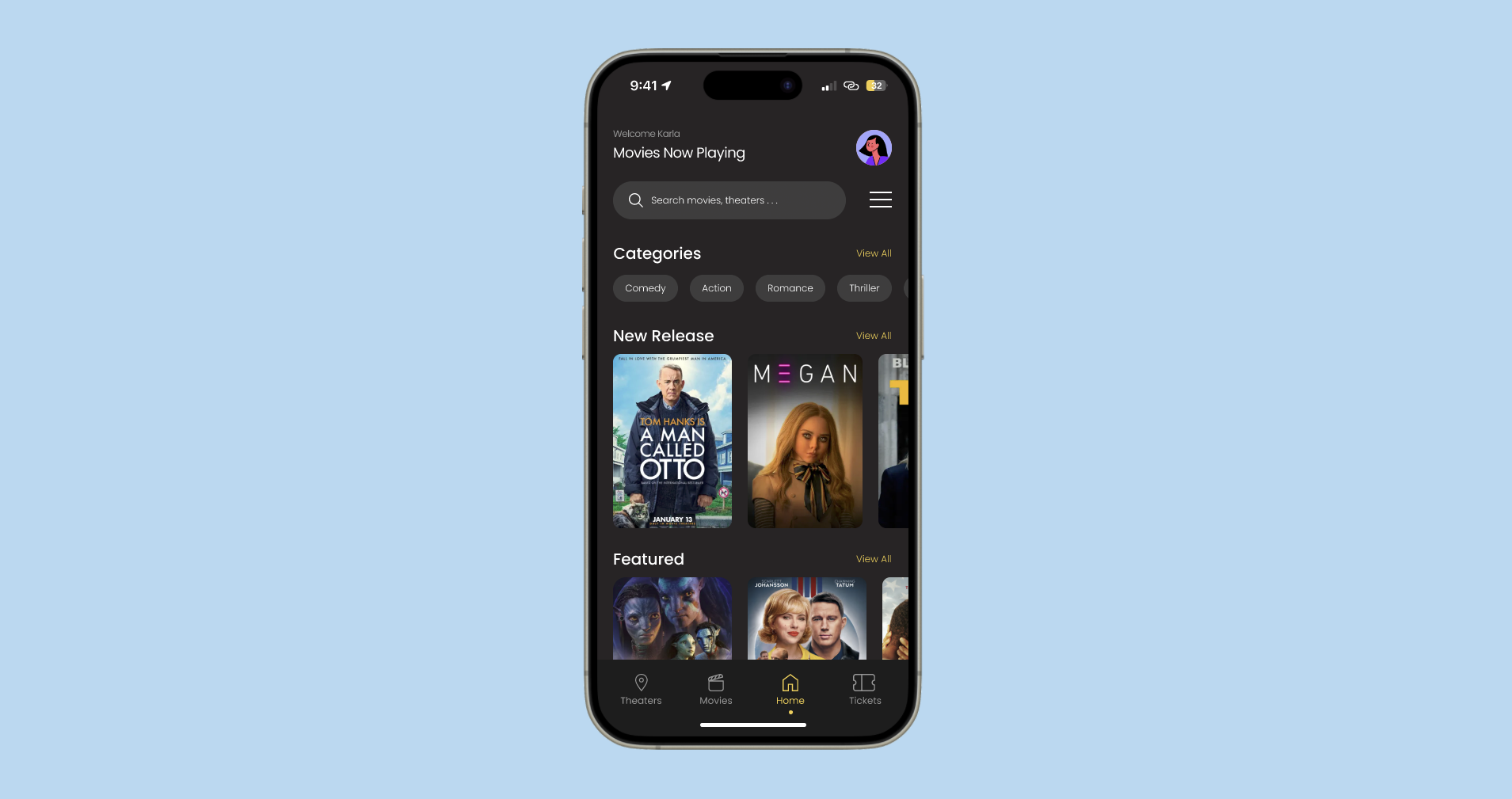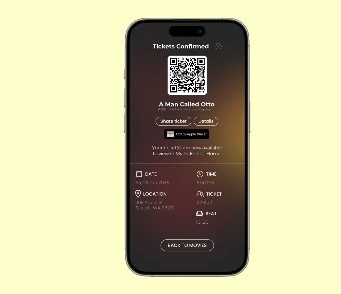 A mobile ticketing wallet that stores the user’s past and current tickets all in one place — no matter the movie theater or location.