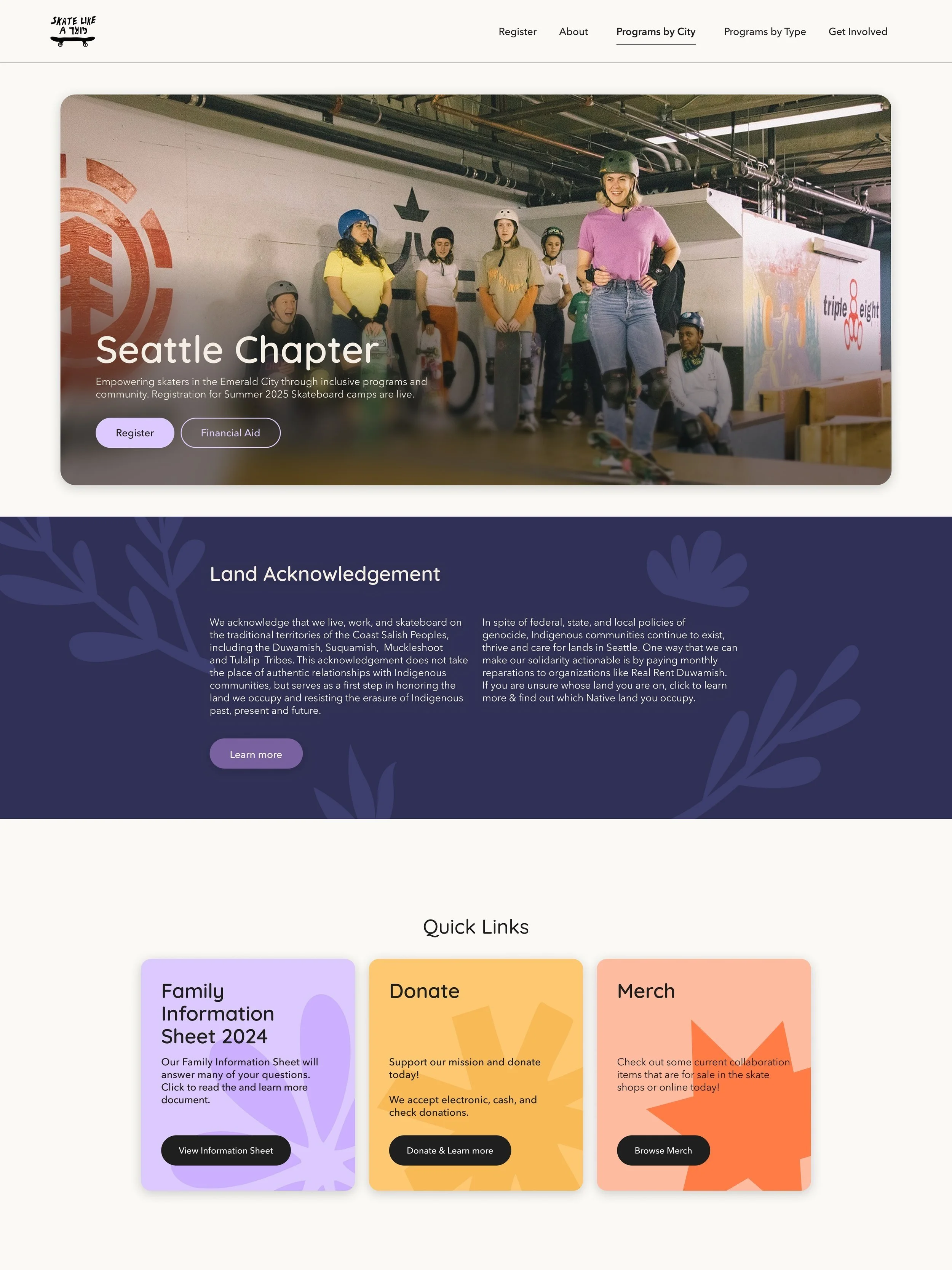 Replaced the header image photo as the main hero image within a UI Card that states the chapter’s location, mission statement, and main call to actions “Register” and “Financial Aid”